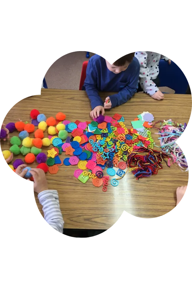 Follows simple class/home “arts routines” (pack up, share, respect materials).
